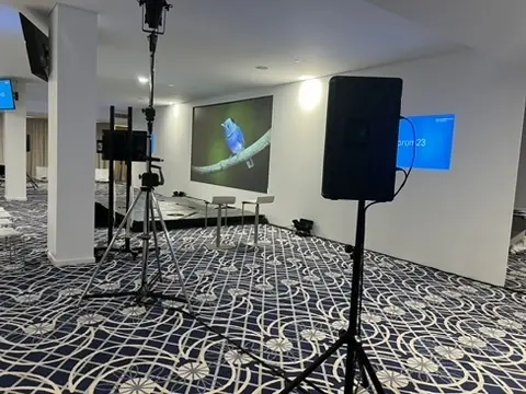 Estruturas e suportes técnicos, palco, rigging, backdrops e soluções de vídeo como ecrã/ledwall (quando aplicável).